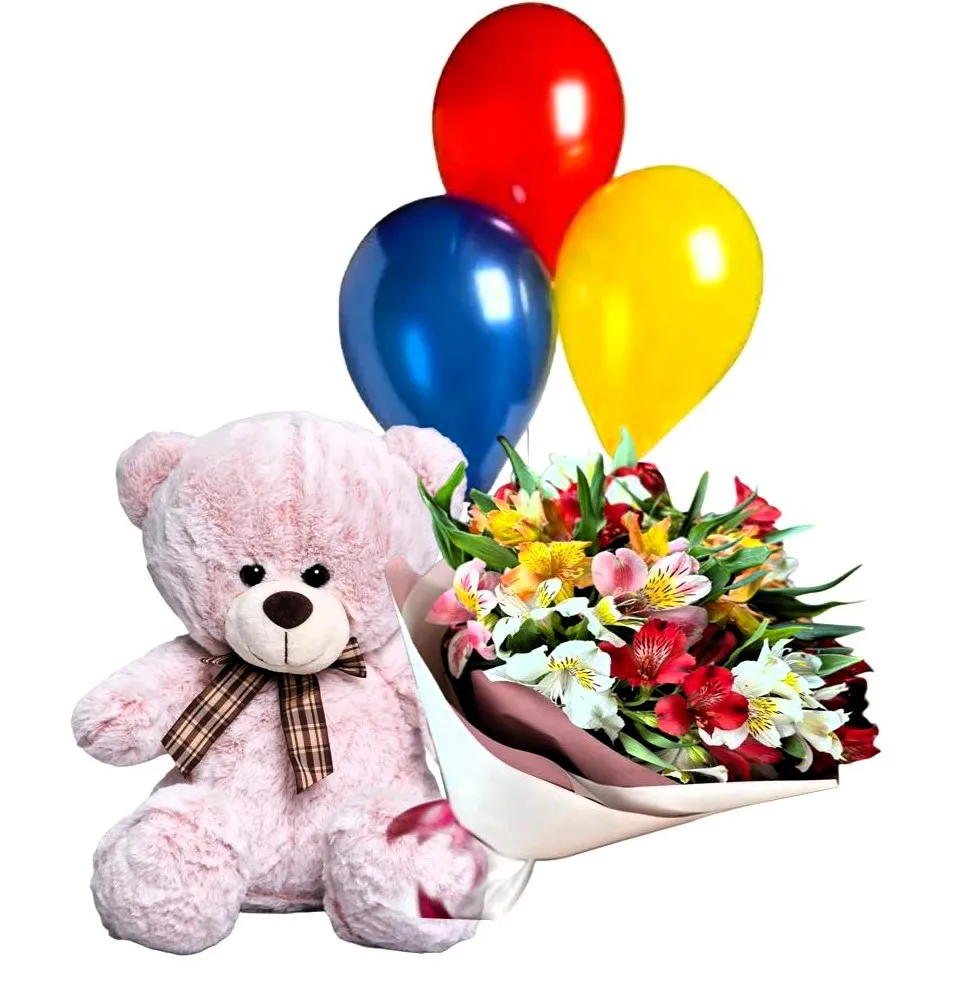 Состав: альстромерия  микс - 9 шт., упаковка, лента+ 3 шарика+ мягкая игрушка 45 см