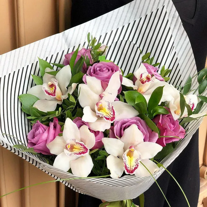 • Стандарт - орхидея - 3 шт., роза - 5 шт., зелень, упаковка, лента