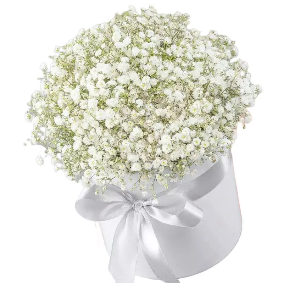 —Букет из белой гипсофилы в шляпной коробке