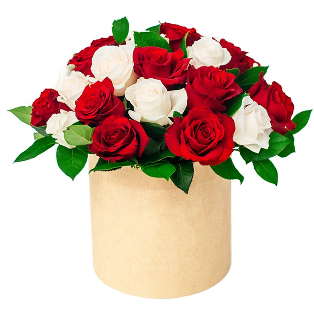 Сочетания белых и красных роз всегда считается отличным решением, особенно, если это касается элегантной цветочной композиции. Розы в стильной шляпной коробке смотрятся органично, а добавление зелени обеспечивает естественность и натуральность. Утонченный цветочный комплект станет великолепным подарком в любой праздник.