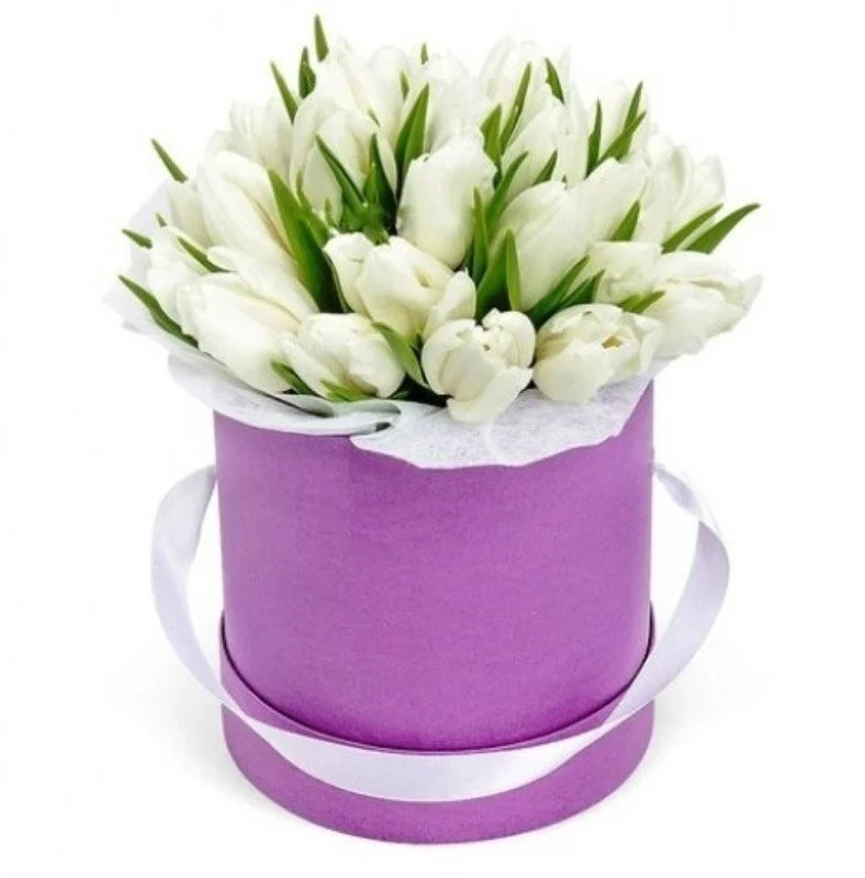 Состав букета: тюльпан 21 шт, оазис, шляпная коробка