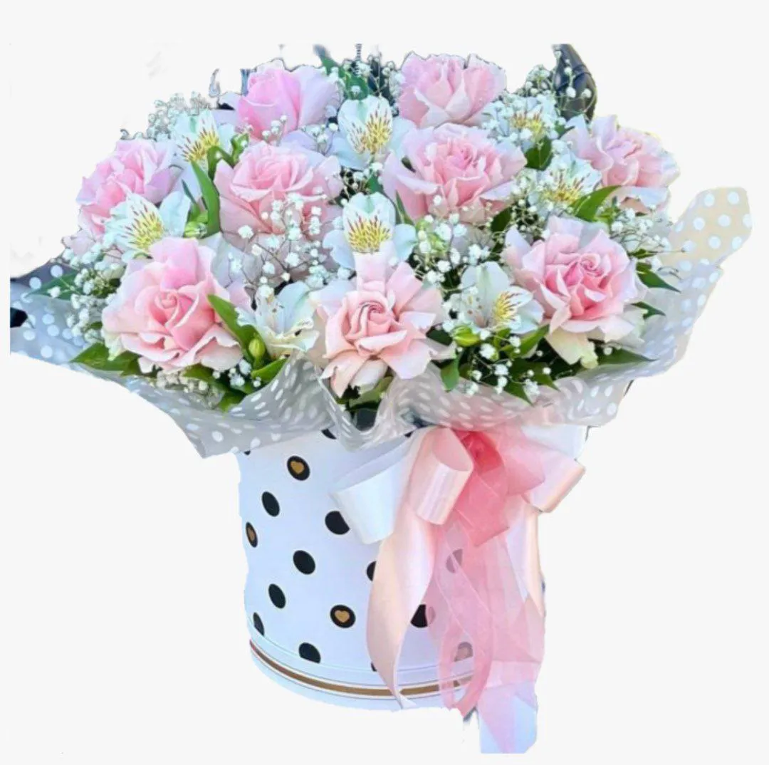 Истинное олицетворение нежности и элегантности — шляпная коробка с розами, альстромерией и гипсофилой.