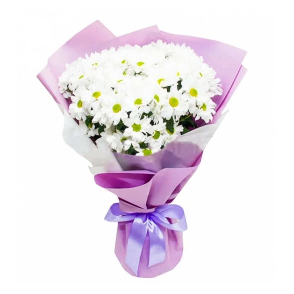 Букет ромашковых хризантем – очень милый и приятный знак внимания для любого значимого человека. Хризантемы всегда актуальны и притягательны. Такой букет можно дарить и без повода!