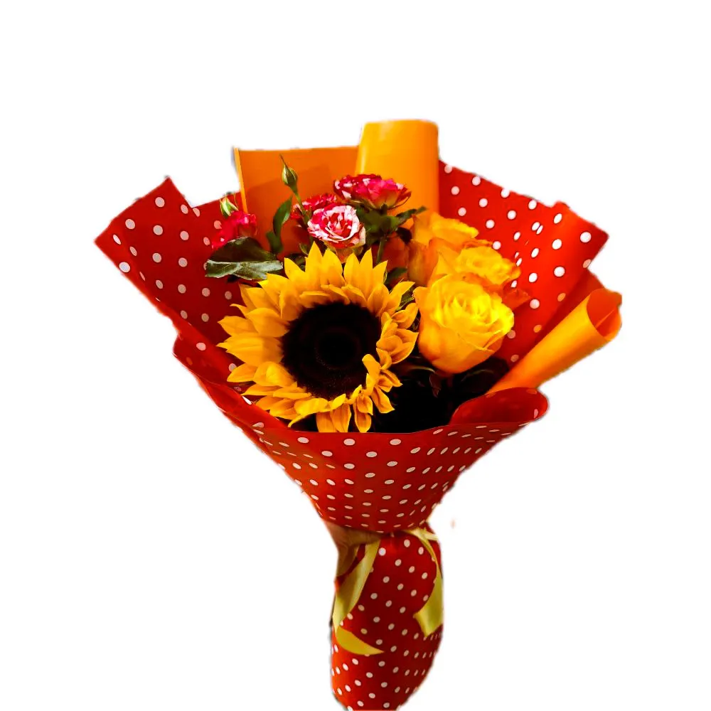 • Средний - роза - 5 шт., кустовая роза - 2 шт., подсолнух - 1 шт., зелень, упаковка, лента